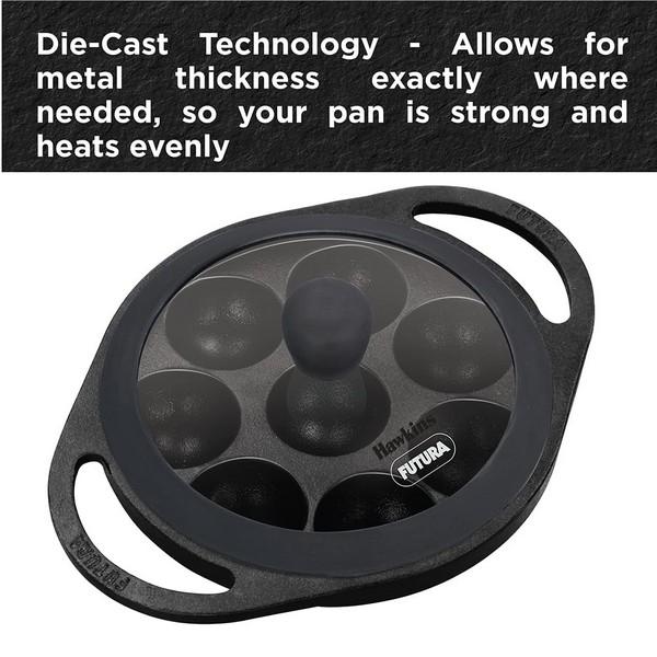 The Hawkins Futura Cast Iron Appe Pan is a versatile kitchen essential, crafting a variety of snacks from traditional appe to Aloo Bonda, Paneer kebabs, and more, all in minutes. Enjoy healthier, tastier, and crispier meals without the need for artificial coatings. Its ability to retain heat ensures even cooking and delicious results every time. As this frying pan is rugged, you can confidently use metal ladles without worrying about damaging its surface. This pan comes pre-seasoned with vegetable oil, ensuring long-lasting durability and effortless maintenance. The heat-proof glass lid features a food-grade silicone rim for a secure fit and added convenience. The high-dome glass lid accommodates food expansion without sticking. Experience years of faithful service with this tough pan.