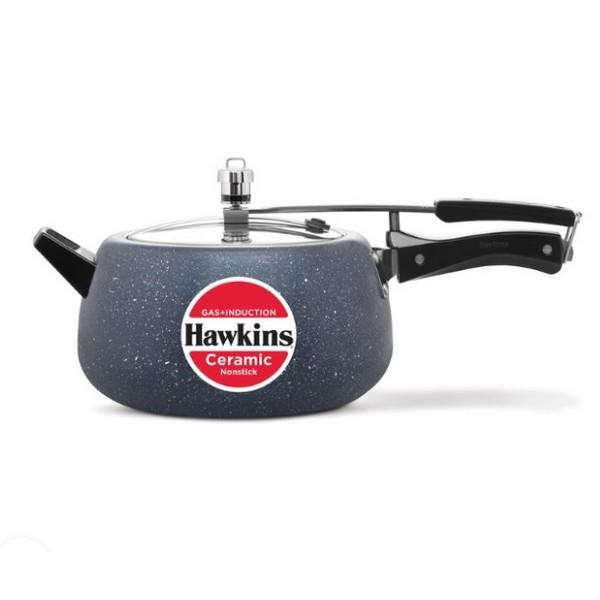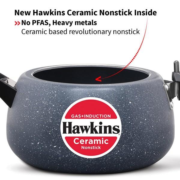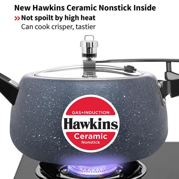 deal for 3 or 4 Persons. New Hawkins Ceramic Nonstick Inside: Excellent release properties - Uses less oil. Not spoilt by high heat - Can cook crisper, tastier. German Ceramic - High quality, lasts longer. No PFAS, Heavy Metals - Ceramic based revolutionary nonstick. Attractive Ceramic Coating Outside - Scratch and stain resistant. Stays looking new for years. The Hawkins Ceramic Nonstick Induction Pressure Cooker is ideal for 3 or 4 persons. The Hawkins Ceramic Nonstick has excellent release properties, which means that it uses less oil when cooking. Additionally, the nonstick coating is not spoiled by high heat, which allows you to cook crisper and tastier food. The German ceramic used in the nonstick coating is of high quality and lasts longer, making it a durable option for your kitchen. Another advantage of this cooker is that the Hawkins Ceramic Nonstick does not contain PFAS or heavy metals, making it a healthier and safer option for cooking. The attractive ceramic coating on the outside is scratch and stain resistant, which means that it will stay looking new for years to come. In terms of performance, this cooker cooks fast and requires less oil. It also works on both gas and induction stovetops, making it a versatile option for any kitchen. Overall, this cooker is an excellent choice for anyone who wants to cook healthy and tasty food quickly and easily