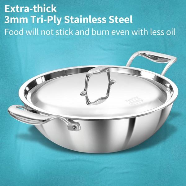 - Extra-thick 3mm Tri-Ply Stainless Steel - Food will not stick and burn even with less oil
