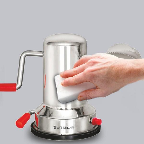 HIGH-QUALITY CONSTRUCTION: Wonderchef coconut scraper is constructed using stainless steel, ensuring its longevity and resistance to wear and tear. ERGONOMICALLY DESIGNED HANDLE: The scraper is designed with user comfort in mind. The scraper comes with a rotatable handle with a comfortable grip, allowing for easy and efficient scraping of coconuts without straining your hands or wrists. SHARP BLADES: The scraper is equipped with sharp and sturdy blades specifically designed for scraping coconuts. These blades effectively remove the coconut meat from the shell, ensuring clean and precise scraping. COMPACT AND PORTABLE: The scraper is compact and lightweight, making it easy to store and transport. Its portable design allows you to use it anywhere, whether in the kitchen or even during outdoor activities like picnics or camping. EASY TO USE: The scraper is straightforward to use, requiring manual effort to scrape the coconut. Simply hold the coconut against the blades and rotate the handle, allowing the sharp blades to remove the meat from the shell. EASY TO CLEAN: The scraper is designed with ease of cleaning in mind. After use, you can easily detach the blades for thorough cleaning and maintenance. It is important to clean the scraper after each use to prevent any residue from accumulating. TRADITIONAL AND AUTHENTIC: The manual coconut scraper offers a traditional and authentic way of scraping coconuts, allowing you to experience the process in its original form. This can be appealing to individuals who prefer a more hands-on approach to food preparation.