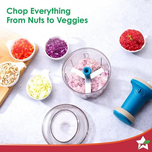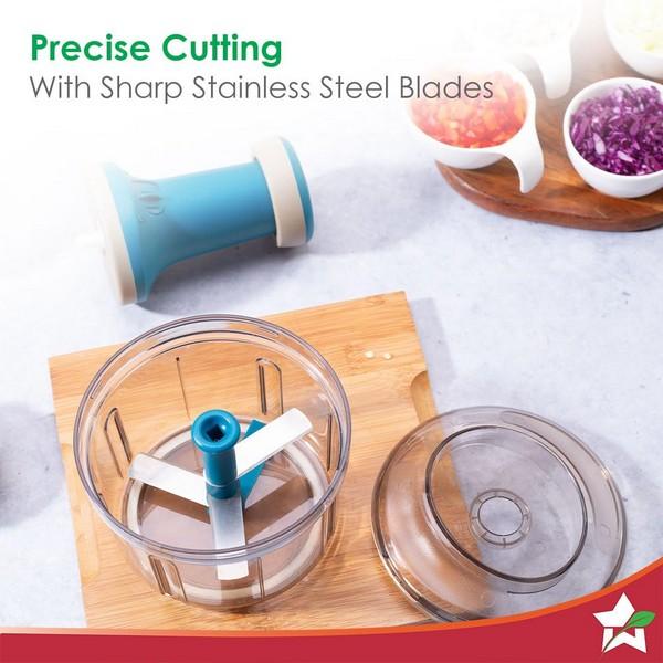 Chop vegetables, nuts, and other hard ingredients with ease. Surgical grade blades at different heights for perfect dicing and chopping. Control the size of the pieces with the number of pushes. Firm antislip grip, unique locking mechanism.